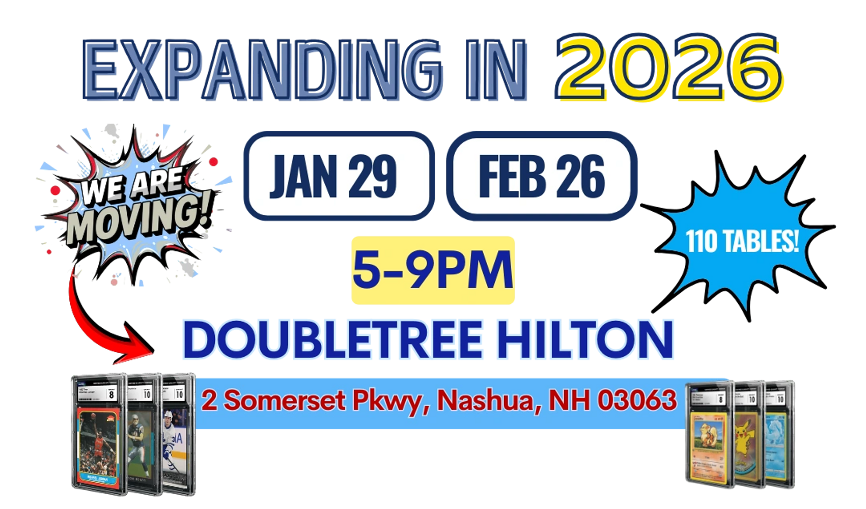 Our New Hampshire based Thursday night card shows are so much fun. Join Daryn & Mike, the father and daughter in law dynamic duo, and 70+ tremendous vendors. Our 110+ tables have a balance of Sport Cards, Pokemon and so much more!