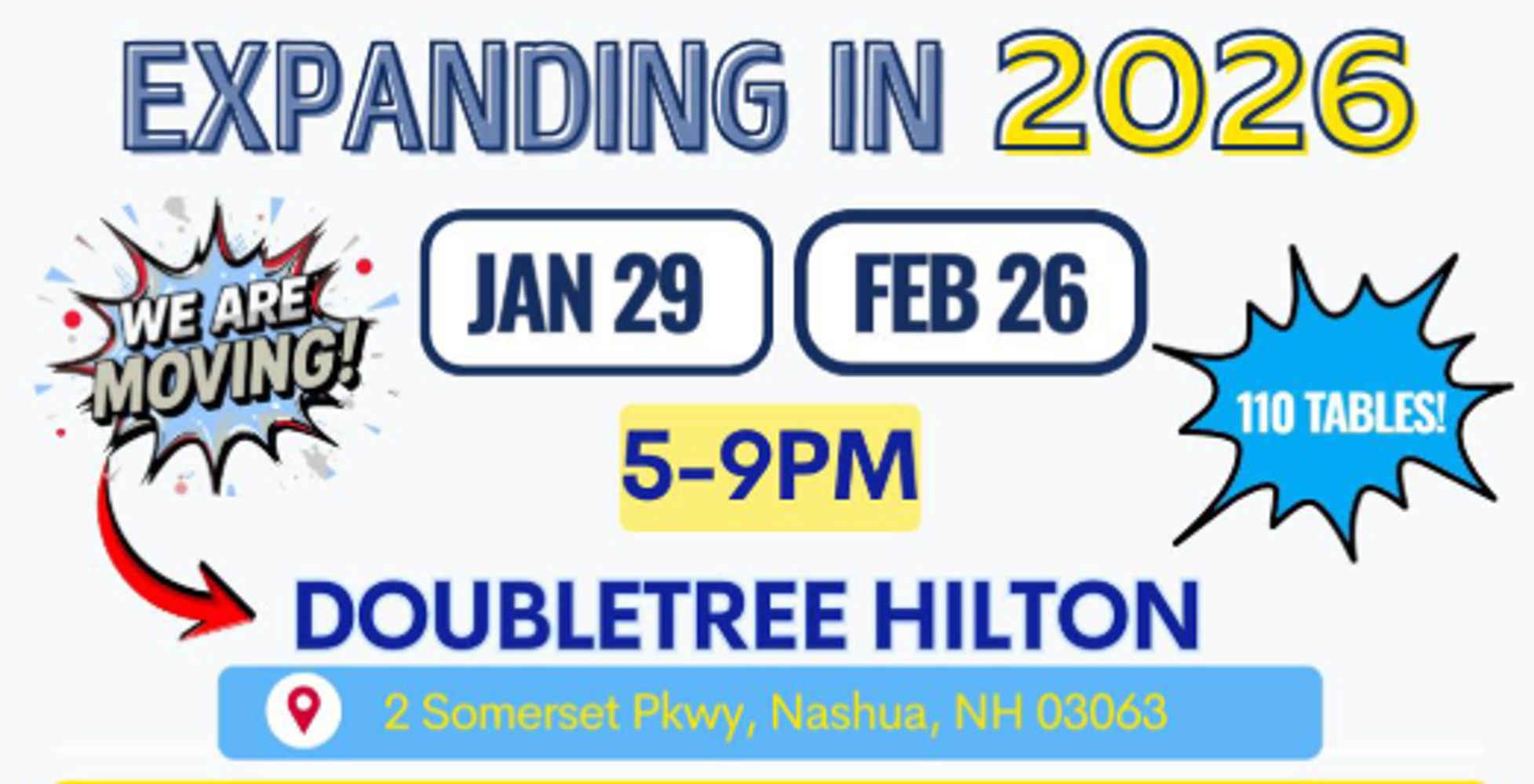 Attend our FREE Thursday Night Card Shows in Nashua New Hampshire, on select dates from 5-9PM! Located at the Doubletree Hilton Nashua. 2 Somerset Pkwy, Nashua, NH 03063
